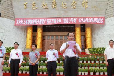 在當天“重走小平路”啟動活動中,團區(qū)委書記李澤宣讀了倡議書。團區(qū)委機關(guān)及直屬單位干部職工、青聯(lián)委員、青年企業(yè)家代表及百色市各界青少年代表2000多人作為首批隊伍參加了紅色體驗。上午,在百色起義紀念碑前舉行主題教育活動,向革命烈士敬獻了花籃,重溫了入黨誓詞,上了一堂特殊的黨課。下午,青少年代表參觀了百色起義紀念公園、百色起義英雄雕塑園,少先隊員們還開展了“在光榮的旗幟下成長”主題隊會。此項活動由共青團廣西區(qū)委、自治區(qū)旅游局、自治區(qū)發(fā)改委、自治區(qū)教育廳、自治區(qū)高校工委、自治區(qū)黨委黨史研究室、自治區(qū)黨校聯(lián)合主辦,活動將歷時一年半的時間,以“開展一次紅色體驗活動、舉辦一次主題巡回宣傳、組織一次感悟活動、參與一次‘紅色網(wǎng)絡(luò)游’,以及舉行攝影、攝像、征文等一系列大型主題活動”等“五個一”為內(nèi)容,向全區(qū)青少年推薦遍布全區(qū)109個縣(市、區(qū))的110條紅色體驗線路、300個紅色景點景區(qū)以及體驗項目和一批紅色網(wǎng)站,通過共青團和相關(guān)部門的組織推動、旅行社的市場運作以及青年自發(fā)組織和社會群眾廣泛參與等方式,動員組織全區(qū)青少年積極參加到活動中來。