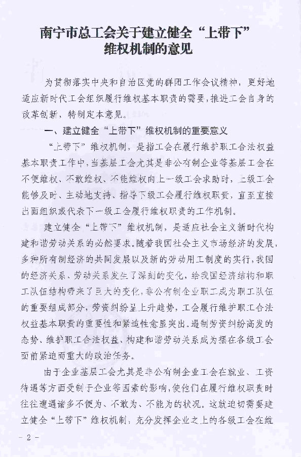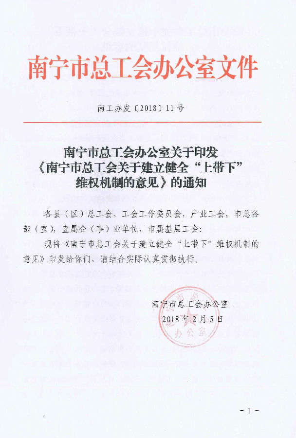 南寧市總工會辦公室關(guān)于印發(fā)《南寧市總工會關(guān)于建立健全“上帶下”維權(quán)機制的意見》的通知