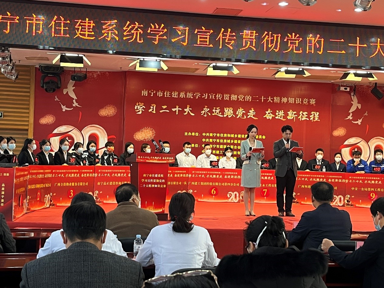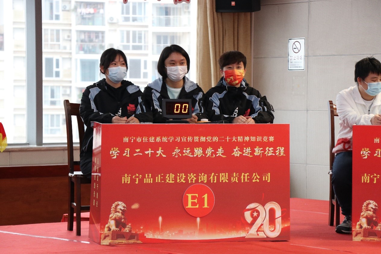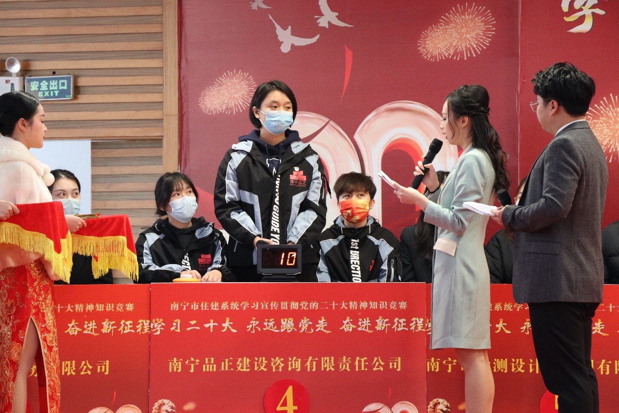 為深入宣傳貫徹黨的二十大精神,全面貫徹落實習(xí)近平總書記在大會期間的重要講話,深刻領(lǐng)悟“兩個確立”的決定性意義,增加“四個意識”、堅定“四個自信”、做到“兩個維護”,引導(dǎo)廣大干部群眾認(rèn)真學(xué)習(xí)領(lǐng)悟黨的二十大提出的新思想、新部署、新要求,通過以賽促學(xué),以賽促用,營造濃厚學(xué)習(xí)氛圍。2023年1月5日、6日,黨員何卉芷、入黨積極分子張藝梅、青年代表覃夏代表品正黨支部參加了由南寧市住建設(shè)行業(yè)黨委舉辦的“學(xué)習(xí)宣傳貫徹黨的二十大精神”知識競賽。取得了第三名的好成績。