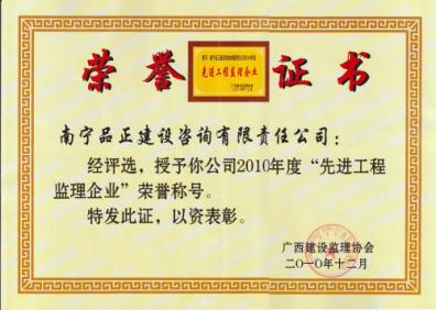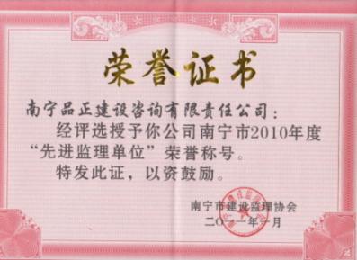 2010年12月,南寧品正獲得廣西建設(shè)監(jiān)理協(xié)會(huì)、南寧市建設(shè)監(jiān)理協(xié)會(huì)分別頒發(fā)的廣西2010年度“先進(jìn)工程監(jiān)理企業(yè)”、南寧市2010年度“先進(jìn)監(jiān)理單位” 榮譽(yù)稱(chēng)號(hào)。公司總工程師陳秋獲得廣西“優(yōu)秀總監(jiān)理工程師” 榮譽(yù)稱(chēng)號(hào),盧天昌、萬(wàn)立名獲得廣西“優(yōu)秀監(jiān)理工程師”榮譽(yù)稱(chēng)號(hào)。陳秋、張學(xué)群、曾振華、馮人杰、萬(wàn)立名獲得南寧市“優(yōu)秀總監(jiān)理工程師”榮譽(yù)稱(chēng)號(hào)。姚思清、黃燕玲、賴(lài)建華、李風(fēng)雷、盧天昌獲得南寧市“優(yōu)秀監(jiān)理工程師”稱(chēng)號(hào)。