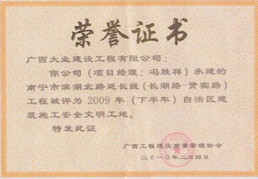 南寧品正負(fù)責(zé)監(jiān)理的廣西農(nóng)科院職工住宅樓(科苑小區(qū))1、2、4、6、8#樓工程、南寧市濱湖北路延長(zhǎng)線(長(zhǎng)湖路-賢賓路)工程、半島·旺角1#、2#、3#、5#樓及商業(yè)裙樓工程等多個(gè)工程分別榮獲市建設(shè)委員會(huì)頒發(fā)的“南寧市建設(shè)工程施工現(xiàn)場(chǎng)安全文明工地”稱(chēng)號(hào)。同時(shí),南寧品正負(fù)責(zé)監(jiān)理的南寧-東盟經(jīng)濟(jì)開(kāi)發(fā)區(qū)D標(biāo)排水主干系統(tǒng)17路段東干渠改造工程也獲得了北海市建設(shè)委員會(huì)、北海市建筑業(yè)聯(lián)合會(huì)共同頒發(fā)的“北海市建設(shè)工程安全文明工地”稱(chēng)號(hào)。