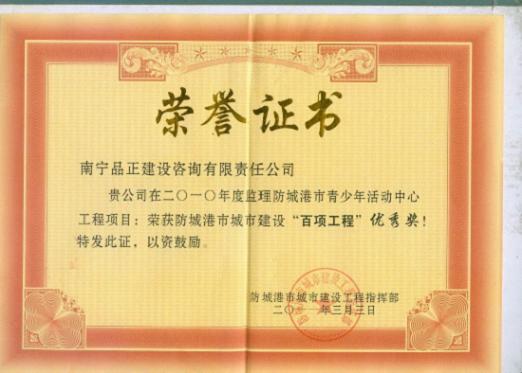 2011年3月3日,南寧品正負責(zé)監(jiān)理的防城港市青少年活動中心工程榮獲防城港市城市建設(shè)工程指揮部授予的2010年度防城港市建設(shè)“百項工程”優(yōu)秀獎。南寧品正將繼續(xù)踐行“科學(xué)規(guī)范、承諾守信、嚴格監(jiān)理”質(zhì)量方針,達到“履行監(jiān)理合同,提供滿意服務(wù)”的質(zhì)量目標。