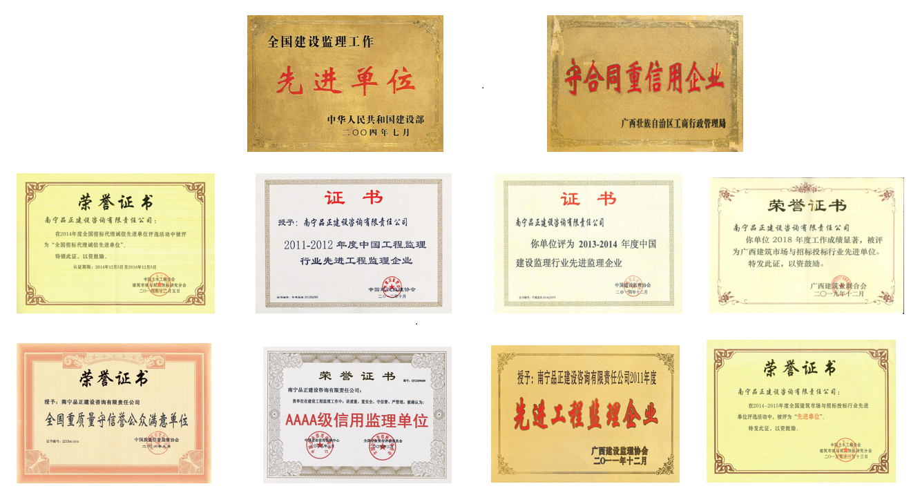 經(jīng)過十幾年的錘煉,積淀了“南寧品正”獨具特色的企業(yè)文化,成功地締造了“南寧品正”品牌。南寧品正是“全國工程監(jiān)理先進單位”、“全國監(jiān)理行業(yè)安全管理先進單位”、“全國重質(zhì)量守信譽公眾滿意單位”、“全國AAAA級資信示范監(jiān)理單位”、“廣西誠信企業(yè)”、“廣西守合同重信用企業(yè)”。在廣西建設(shè)監(jiān)理協(xié)會和南寧市建設(shè)監(jiān)理協(xié)會組織的歷次評選中,均被評為“廣西先進工程監(jiān)理企業(yè)”、“南寧市先進監(jiān)理單位”,連續(xù)多年被評為南寧市城鄉(xiāng)建設(shè)系統(tǒng)“先進單位”、“先進基層黨組織”、“宣傳工作先進單位”,并被評為“南寧市先進單位”。公司所承擔(dān)監(jiān)理和實施項目管理的工程項目共獲得數(shù)十項國家、省部級、自治區(qū)和市級獎項。