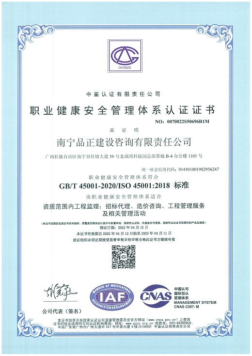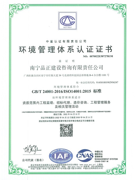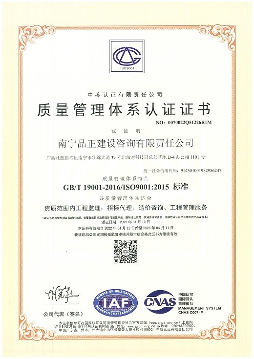 南寧品正于2000年通過ISO9001:2000質(zhì)量體系認(rèn)證,2009年改版為ISO9001:2008并通過認(rèn)證;2016年5月同時(shí)通過GB/T19001-2008質(zhì)量管理體系、GB/T28001-2001職業(yè)健康安全管理體系認(rèn)證和GB/T24001-2004環(huán)境管理體系三體系認(rèn)證。公司長期重視管理體系認(rèn)證與實(shí)際工作的結(jié)合,制定行之有效的檢查及內(nèi)審程序文件,形成了完整的《管理手冊》、《程序文件》、《標(biāo)準(zhǔn)作業(yè)指導(dǎo)書》三個(gè)層次的質(zhì)量體系文件。每年定期進(jìn)行工作質(zhì)量檢查、質(zhì)量體系內(nèi)審和管理評審,確保公司整體質(zhì)量、環(huán)境和職業(yè)健康安全工作的有效性、持續(xù)性,達(dá)到規(guī)范化和標(biāo)準(zhǔn)化。